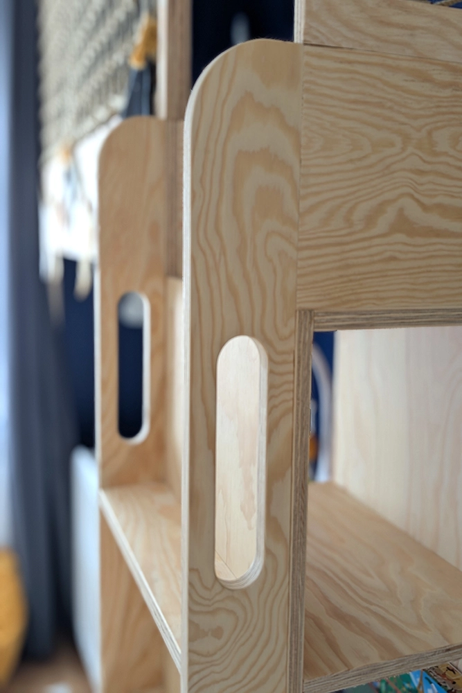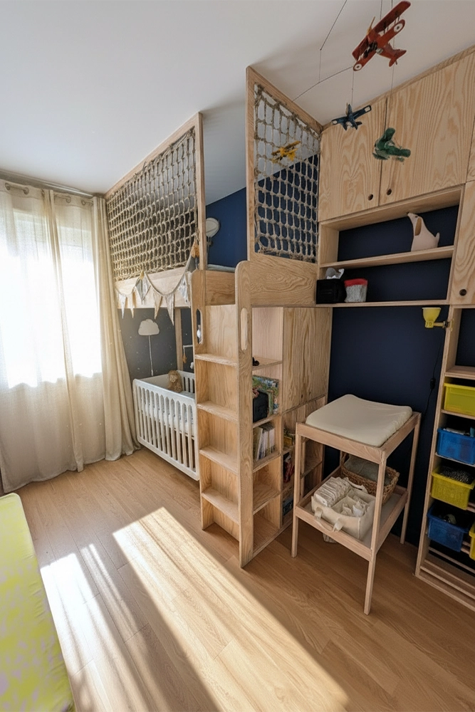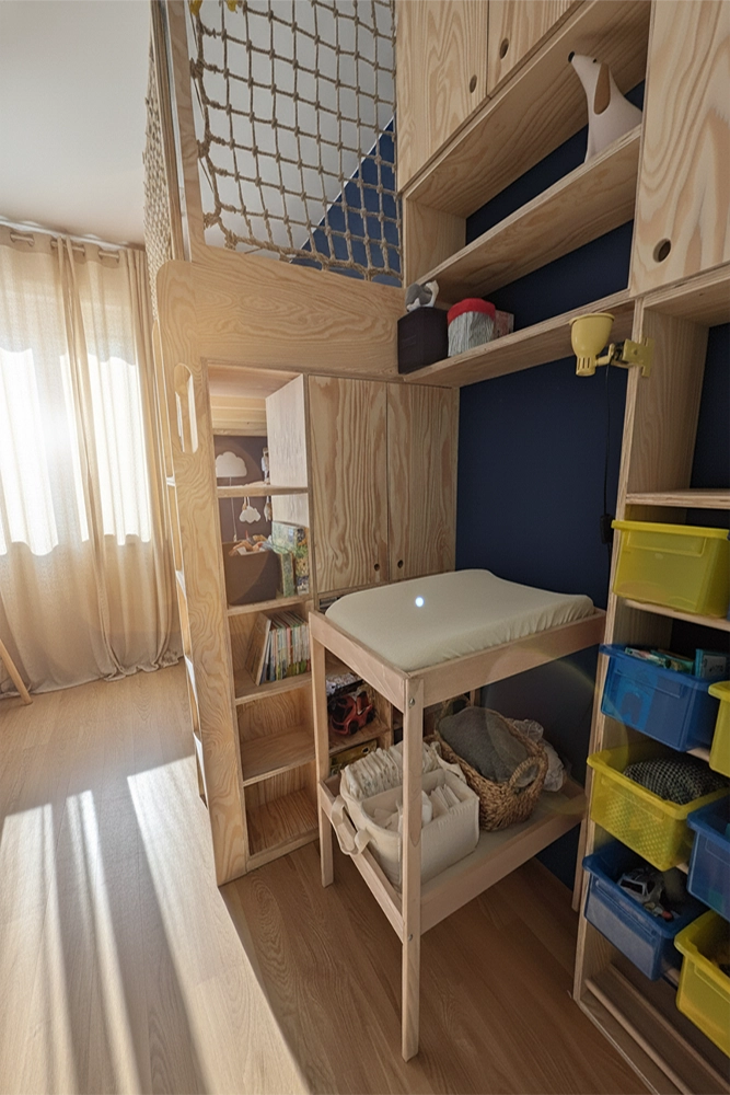 Un lit mezzanine sur-mesure, imaginé et dessiné spécifiquement pour le projet, intègre de nombreux rangements afin d’accueillir jouets, livres, et autre, tout en libérant de l’espace au sol. Un coin table à langer évolutif complète l’aménagement et a été pensé pour se transformer, à terme, en coin bureau.